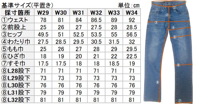 実寸ウエストサイズ(インチ):W29・W30・W31・W32・W33・W34